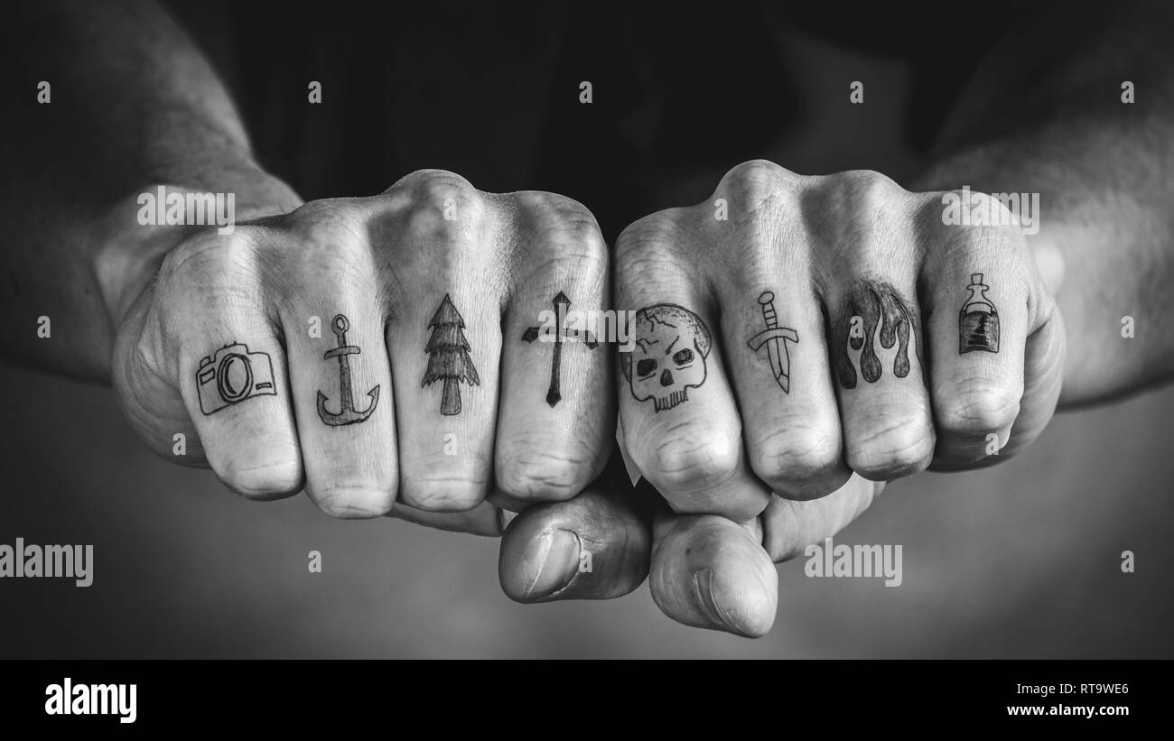 Close Up Of Tattoos On Fingers And Knuckles Black And White