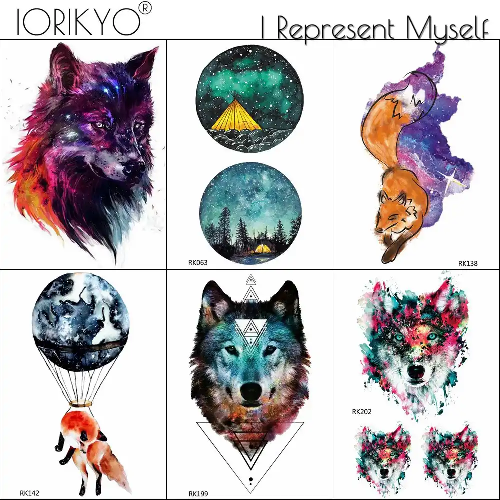 Galaxy Wolf Moon Wolf Geometric Waterproof Fake Tattoos Stickers For Men Arm Temporary Tattoo For Women Chest Custom Tatto Decal